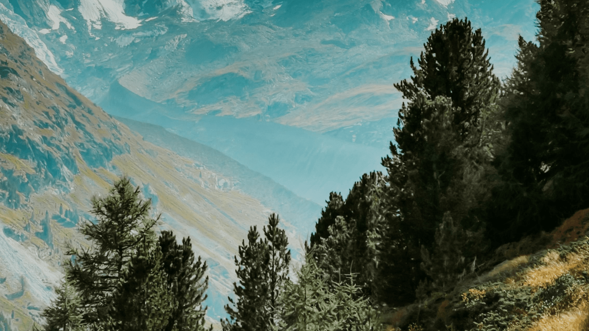 Layers of mountains fade into the distance, their shapes softened by a cool haze, while evergreen trees stand tall in the foreground. The shifting light brings out subtle tones across the slopes, revealing the depth and scale of the landscape. It’s a view that feels both grounded and expansive, inviting you to take a moment and look a little farther.