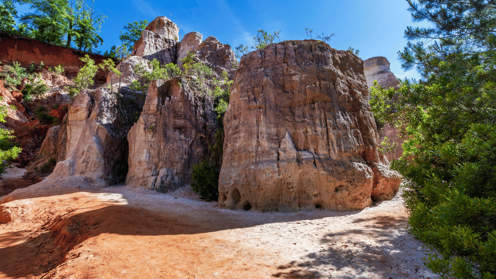 Providence Canyon in southwest Georgia is often referred to as “Georgia’s little Grand Canyon.” This network of gorges was created by the erosion of soft, multicolored soil. Providence Canyon features several chasms, plateaus, cliffs, and pinnacles.